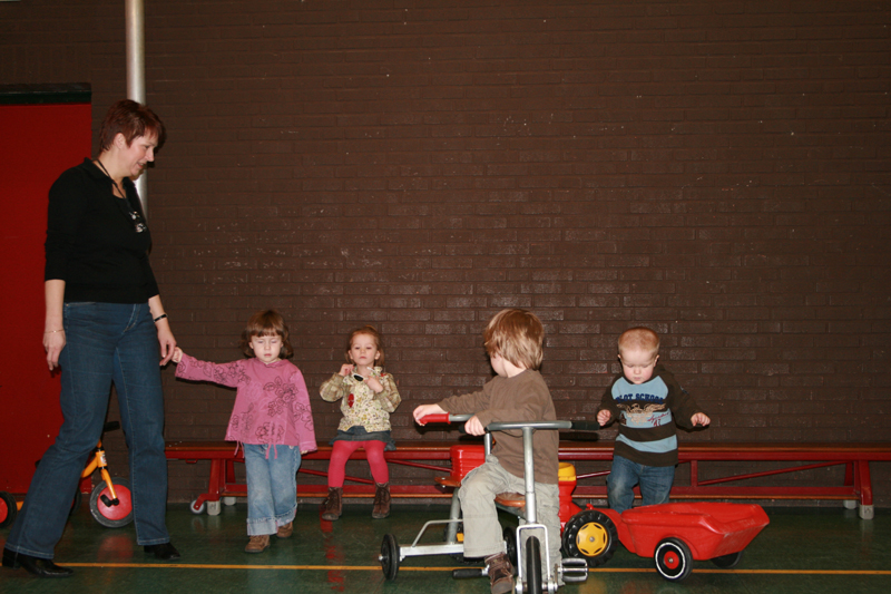 Tijdens het speelkwartier kunnen de kinderen hun energie kwijt in de grote gymzaal met trapfietsen/traptrekkers of met hoepels en ballen.